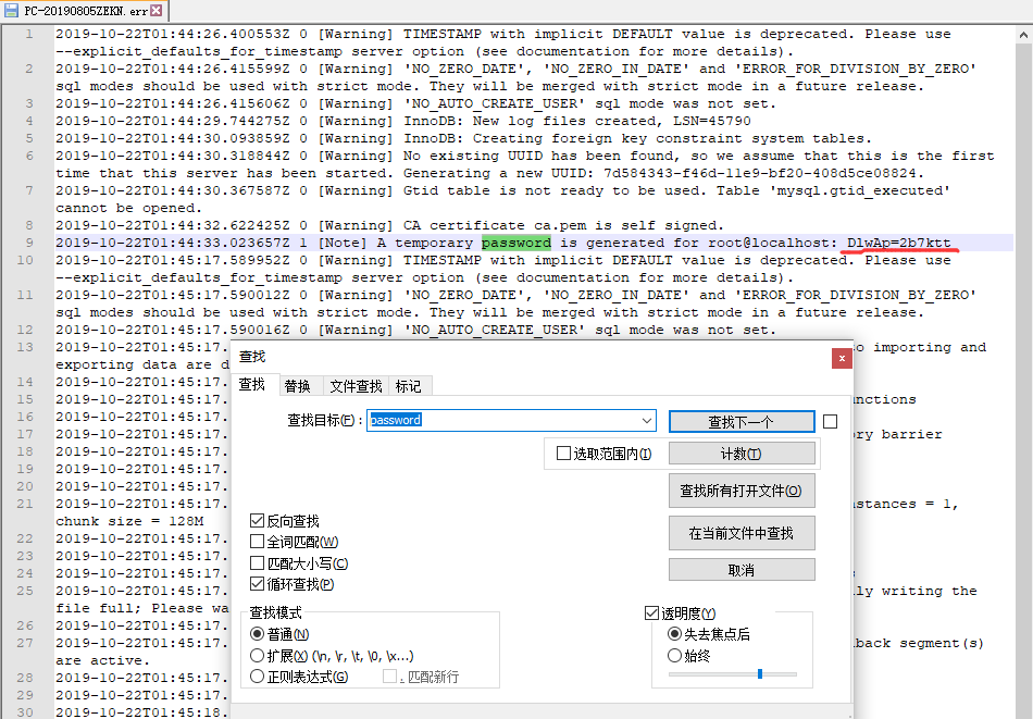 在data目录下找到XXX.err文件并打开,找到初始化的随机密码password